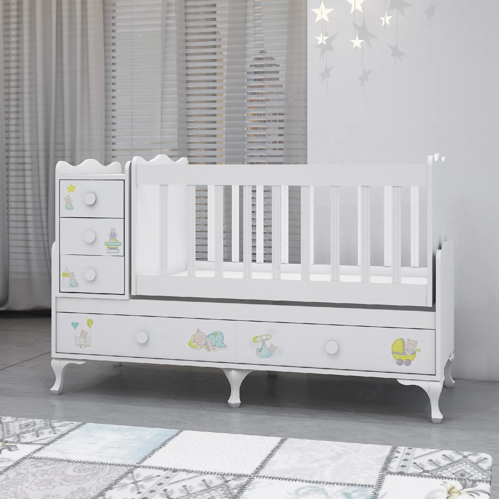 Ürünümüzü beşik olarak kullandırktan sonra 3 çekmeceli komodin ve 2 çekmeceli 65x160 karyola olarak kullanabilirsiniz.