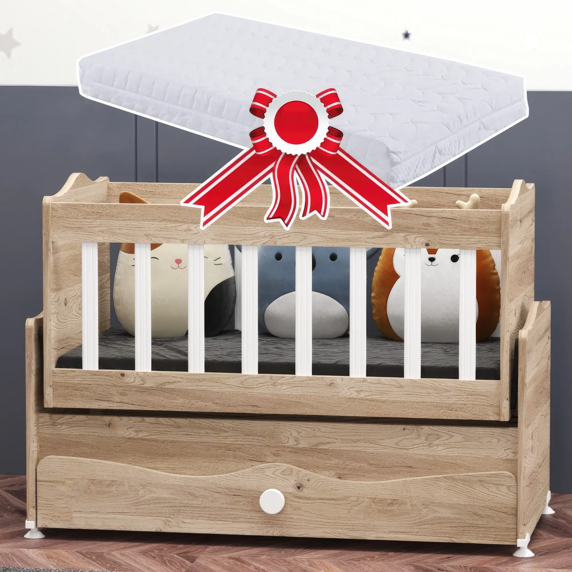 İnci Çekmeceli Anne Yanı Bebek Beşiği - Meşe + Yatak Hediyeli