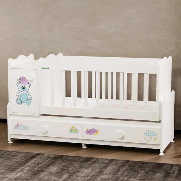 Ürünümüzü beşik olarak kullandırktan sonra kapaklı komodin ve 2 çekmeceli 65x160 karyola olarak kullanabilirsiniz.